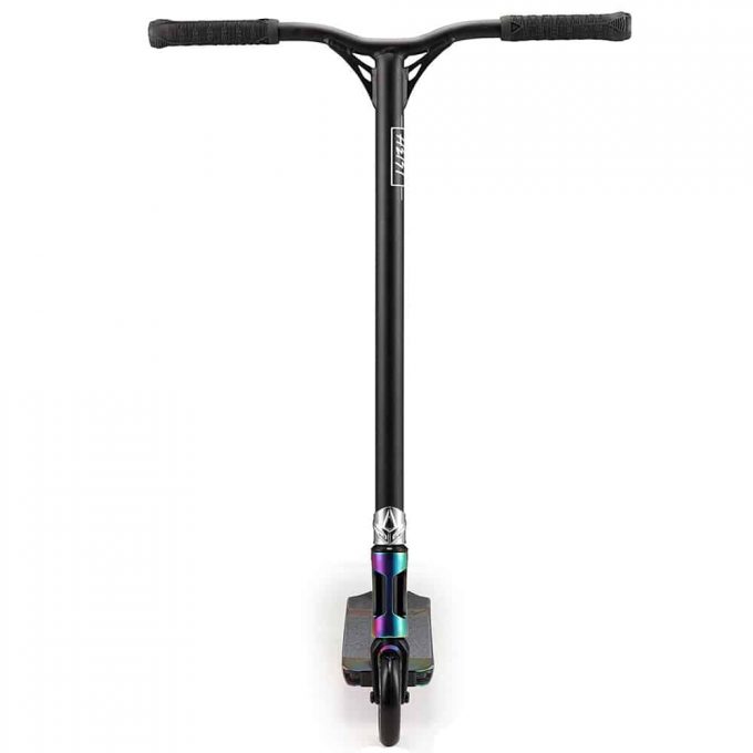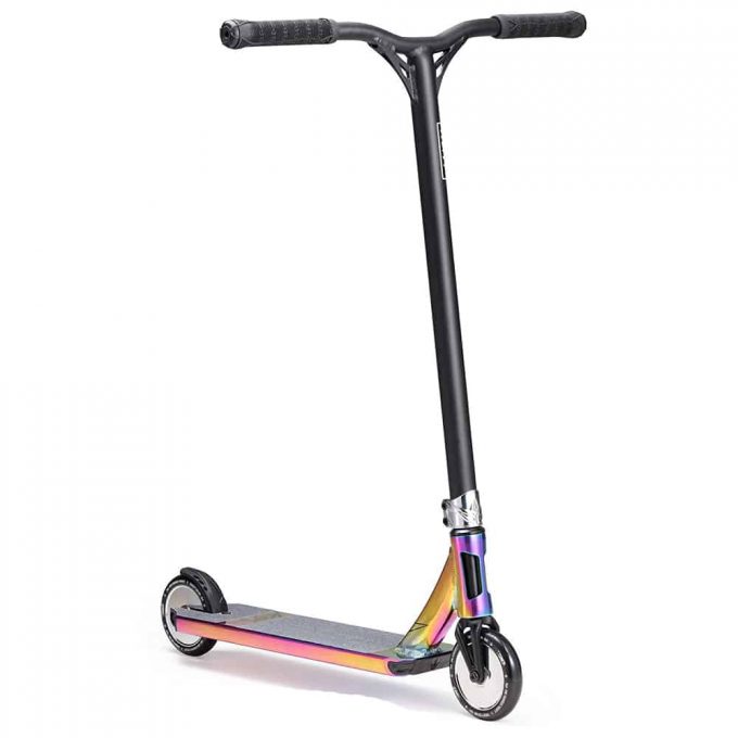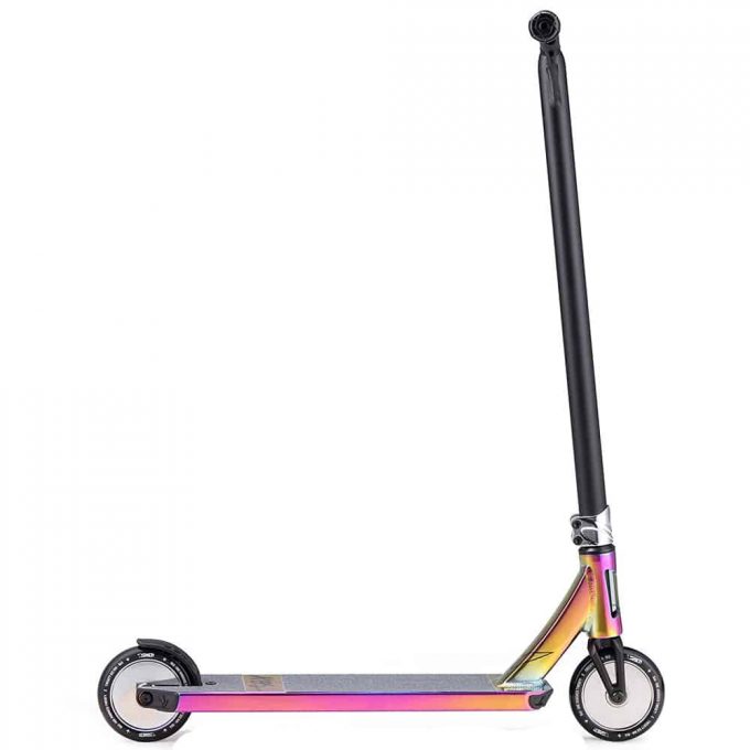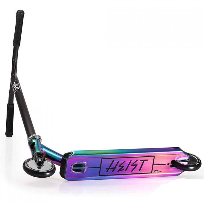 Complete Pro Scooters, Envy Pro ScootersEnvy KOS Heist S5 The KOS Heist S5 comes with High Grade 7 series aluminum Reaper bars 25.6″ high x 22.8″ wide and TPR Hand Grips that are extremely durable and offer the perfect grip for any style of riding with a new 2 Bolt forged clamp and 6mm Bolts for extra strength. The fork is the classic SOBV3 IHC Forks made with the best 6061 grade Aluminum and with high quality color finishes, the wheels come in 120mm X 26mm Hollow Core Wheels with 86a grade Polyurethane with performance bonding to reduce the risk of dehubbing. To finish it off the deck is our standard KOS 6061-T6 Extruded Aluminum deck in a Oil Slick finish 4.7″ wide x 20″ long and a CNC 82.5 degree angled Head tube. . This is a great scooter for the more advanced rider!