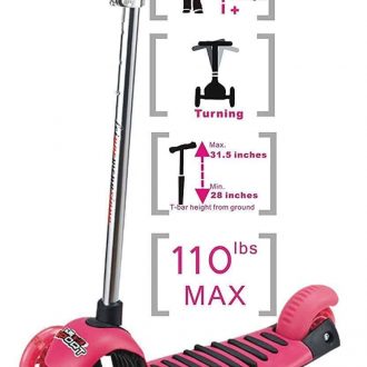 Kids ScootersGet the party started! it’s your little rider’s time to shine with the glitter and Glam of the Lil’ pop. With twice the turning radius of previous Razor Jr. Scooters and intuitive tilt-to-turn steering, the Lil’ pop helps youngsters discover their balance and coordination, so when they step onboard it’s all flashing lights and fabulous fun. Features tilt-to-turn steering, three-wheel stance, steel handlebars, foam grips, and polymer wheels. Comes with two button cell Cr2032 lithium batteries one included and replaceable). approximate battery life: 20 hours or 3,600 cycles. Recommended for ages 3 and older and will support a rider up to 48 pounds. The buyer and rider of Razor Jr. Scooters are responsible for knowing and obeying all local, state and federal regulations regarding the riding and use of all Razor scooters.